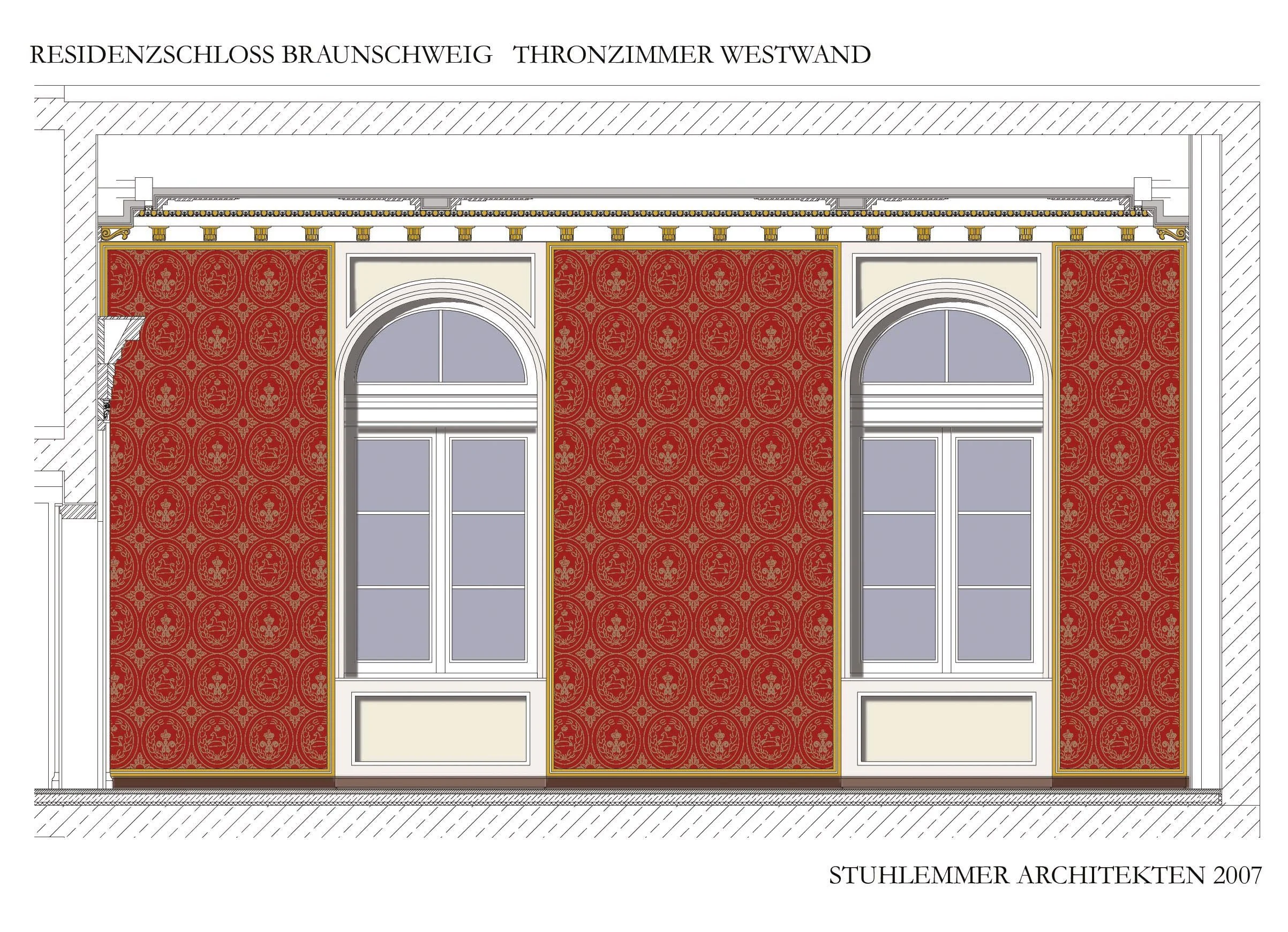 Im Zuge des Wiederaufbaus des Braunschweiger Residenzschlosses wurde ein Stahlbetonbaukörper errichtet und von außen mit der Rekonstruktion der historischen Fassade bekleidet. Im Inneren sollten die Räumlichkeiten des ehemaligen Schlosses wieder entstehen, zumindest im linken Flügel, dem späteren Schlossmuseum. Dieser Auftrag begann mit Recherche historischer Fotos und von Fragmenten der damaligen Ausstattung. Oft wurden zunächst Handskizzen angefertigt und dann die Rekonstruktionsplanung erstellt. Diese war dann zusammen mit den Fotos und Fragmenten die Grundlage für die ausführenden Handwerker, Modellbildhauer und Stuckateure. Rekonstruiert wurde die gesamte Ausstattung einschließlich des Thronhimmels, der Türen, der Geländer, der Vorhänge usw.. Ausstellungskonzeption: von Jacobs Ausstellungsdesign